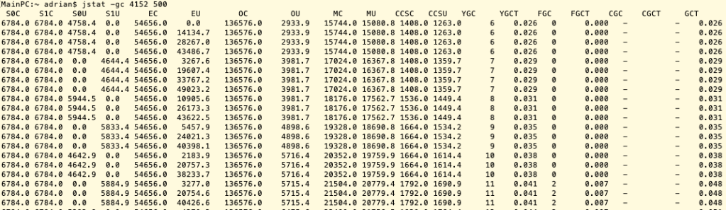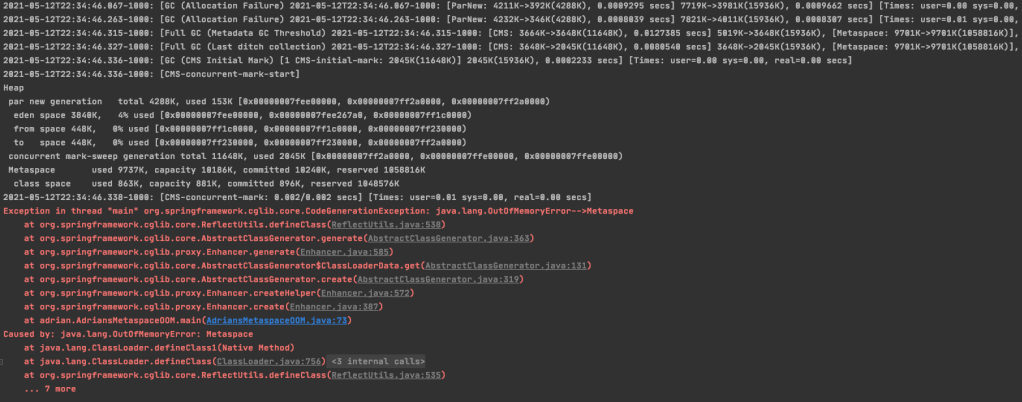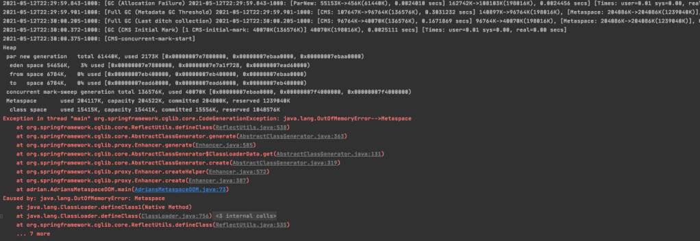 From the above screenshot, we can see there’s one CMS FGC finished before the final application crash. The application crashed here before I deliberately keep adding unreleasable class to the metaspace. Therefore, in the real practise if the CMS FGC finished before the final crash can release some memory space for the metaspace, then we give the chance for the application to continue to work without crash.