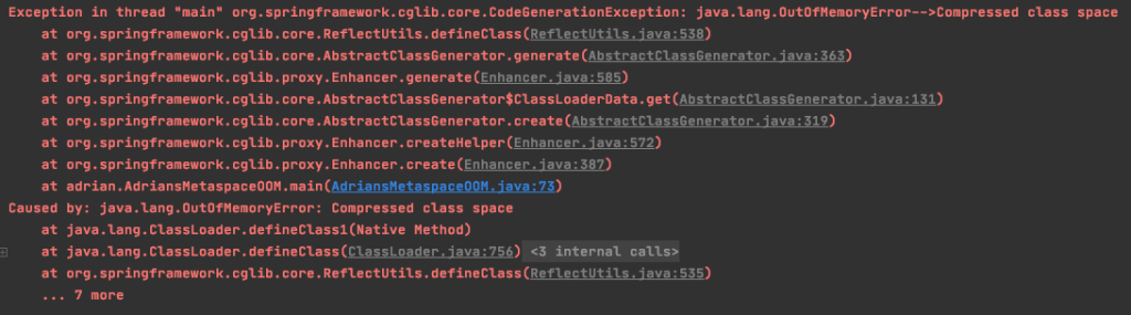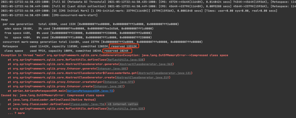 If you compare this screenshot with other screenshots in this article without XX:CompressedClassSpaceSize parameter, we will find the differences are the reserved size and limited of the Compressed class OOM.