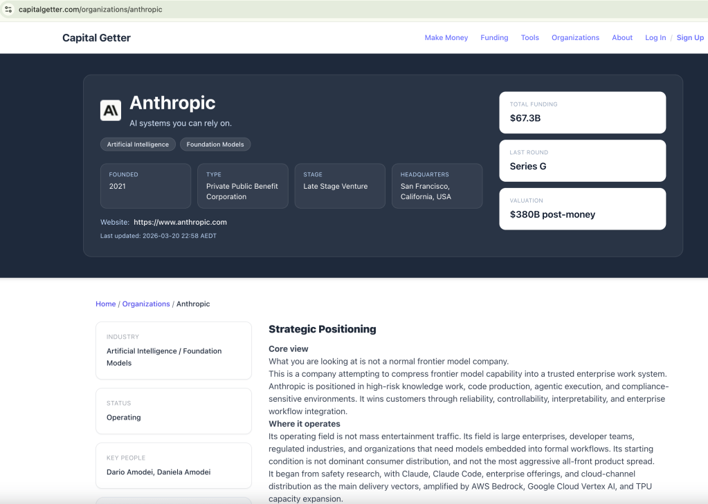 "markdown": "**Core view**\n\nWhat you are looking at is not a normal frontier model company.\n\nThis is a company attempting to compress frontier model capability into a trusted enterprise work system. Anthropic is positioned in high-risk knowledge work, code production, agentic execution, and compliance-sensitive environments. It wins customers through reliability, controllability, interpretability, and enterprise workflow integration.\n\n**Where it operates**\n\nIts operating field is not mass entertainment traffic. Its field is large enterprises, developer teams, regulated industries, and organizations that need models embedded into formal workflows. Its starting condition is not dominant consumer distribution, and not the most aggressive all-front product spread.\n\nIt began from safety research, with Claude, Claude Code, enterprise offerings, and cloud-channel distribution as the main delivery vectors, amplified by AWS Bedrock, Google Cloud Vertex AI, and TPU capacity expansion.\n\n**OpenAI contrast**\n\nBy contrast, OpenAI has pushed itself toward the shape of a general intelligence operating system: one side captures massive user and enterprise seats through ChatGPT, while the other expands capability into broader populations and use cases through deep research, agents, image, voice, and infrastructure programs.\n\nThe split between Anthropic and OpenAI is not about who can build models. It is about who is using which structure to consume the future value chain.\n\n**Bottom line**\n\nAnthropic wants to lock down high-trust, high-ACV, high-retention workflows first. OpenAI wants to occupy the cognition entry point, the work entry point, and the infrastructure entry point first."