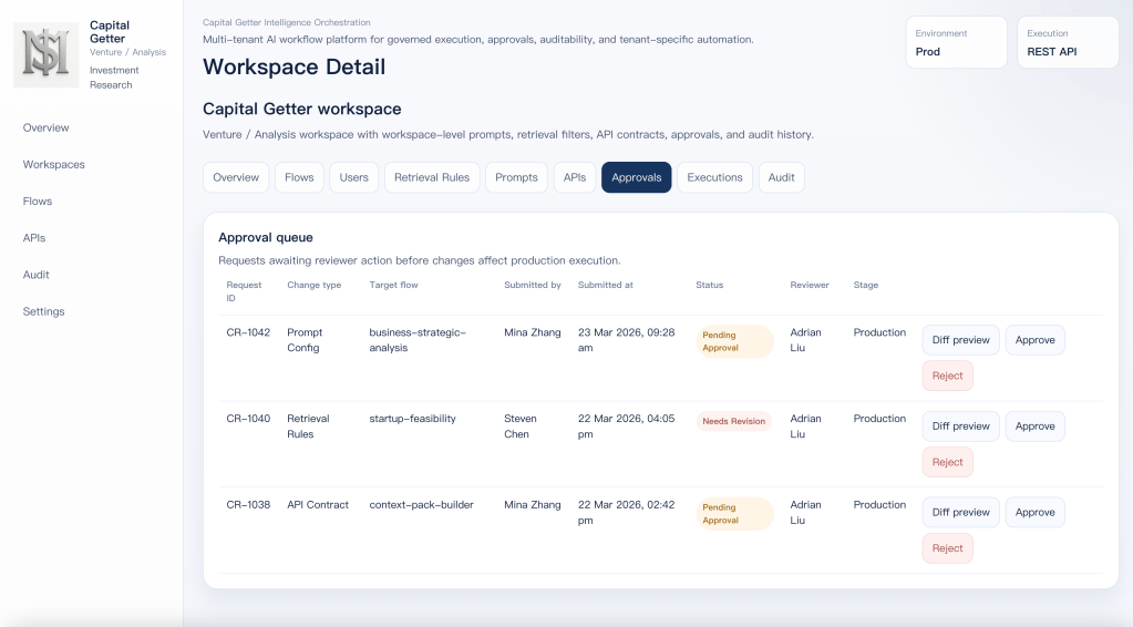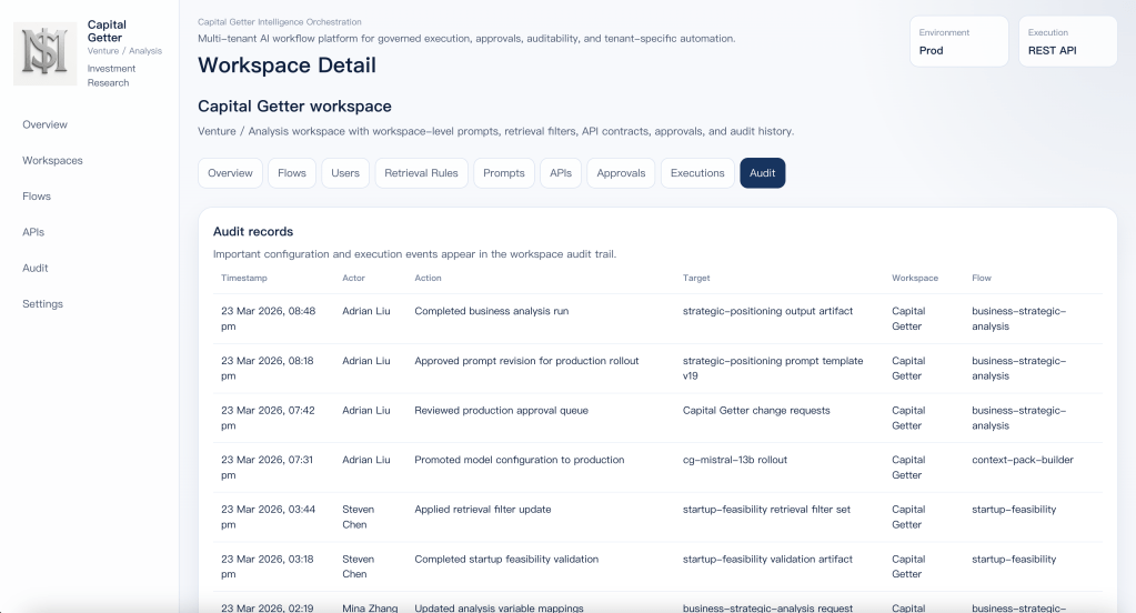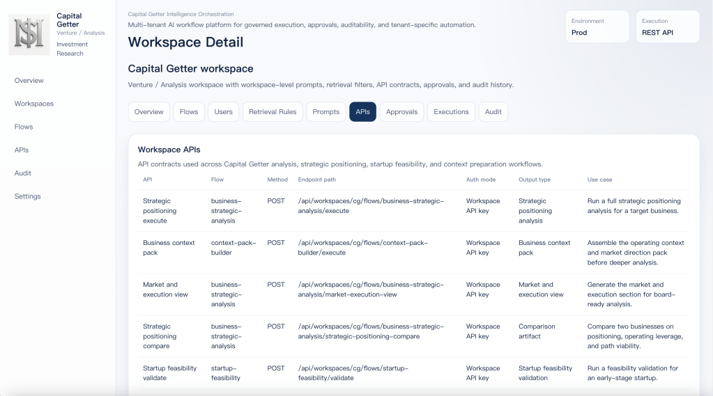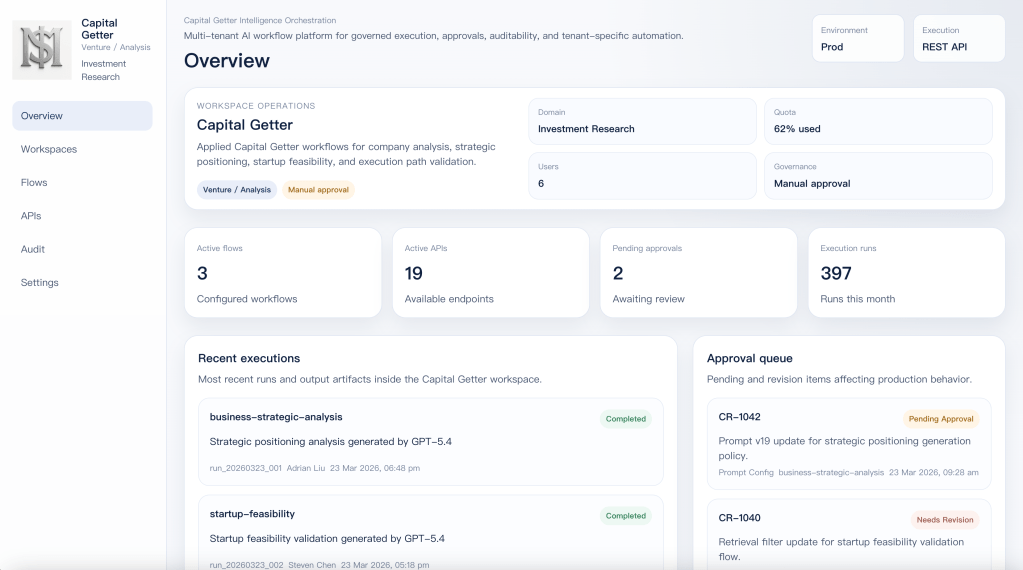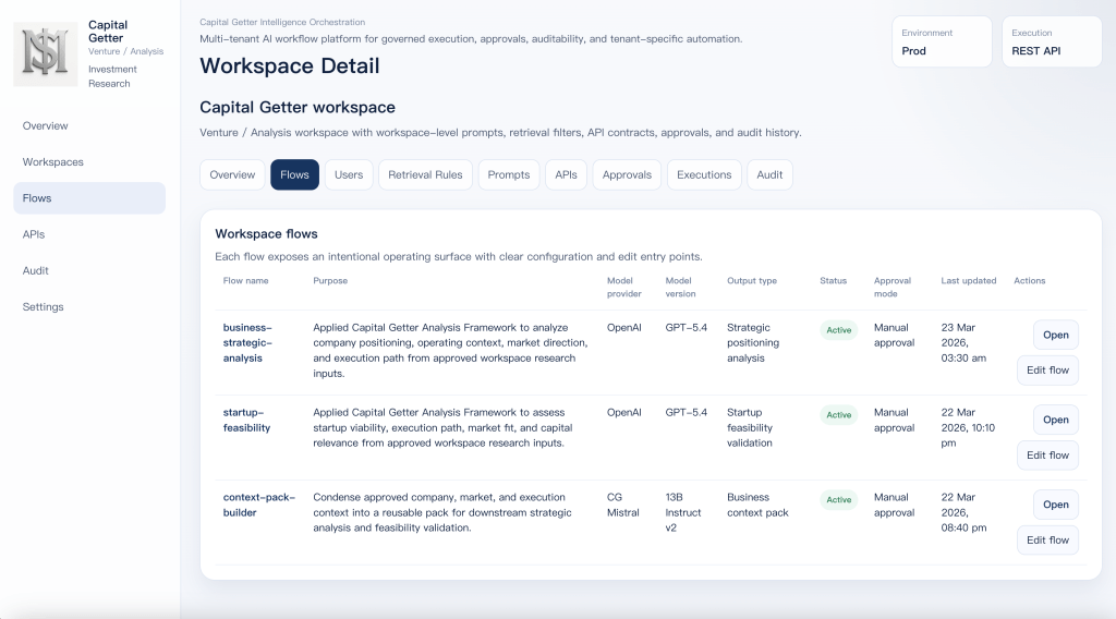 It runs as a reusable workspace on top of a shared execution platform. Capital Getter keeps its own prompts, retrieval rules, flows, output contracts, approvals, and audit trail without needing its own separate platform stack.